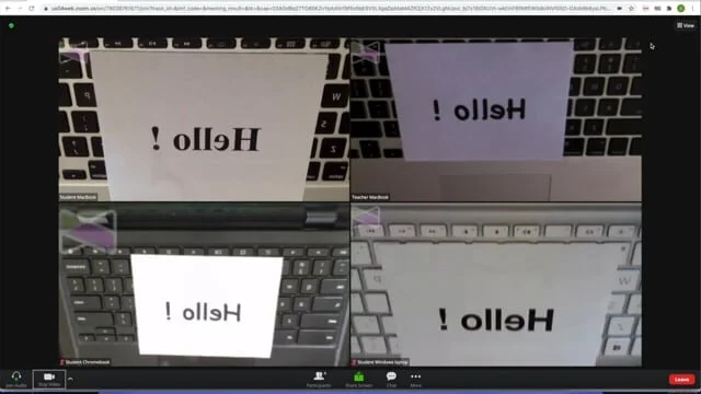 The simplest approach for seeing your students’ work is to use a Chrome extension called VideoMirror. Enabling VideoMirror flips your view of every other participant’s video.