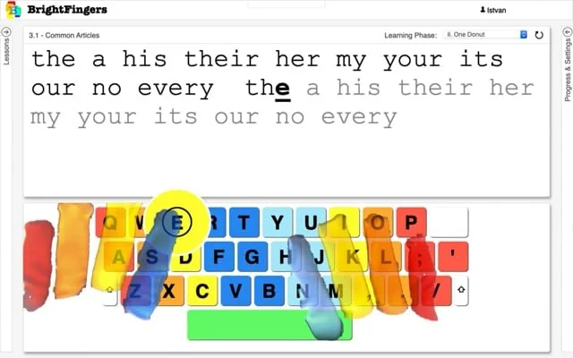 The following videos show a 3rd Grader practicing touch typing for the very first time, using the BrightFingers Finger Recognition system.