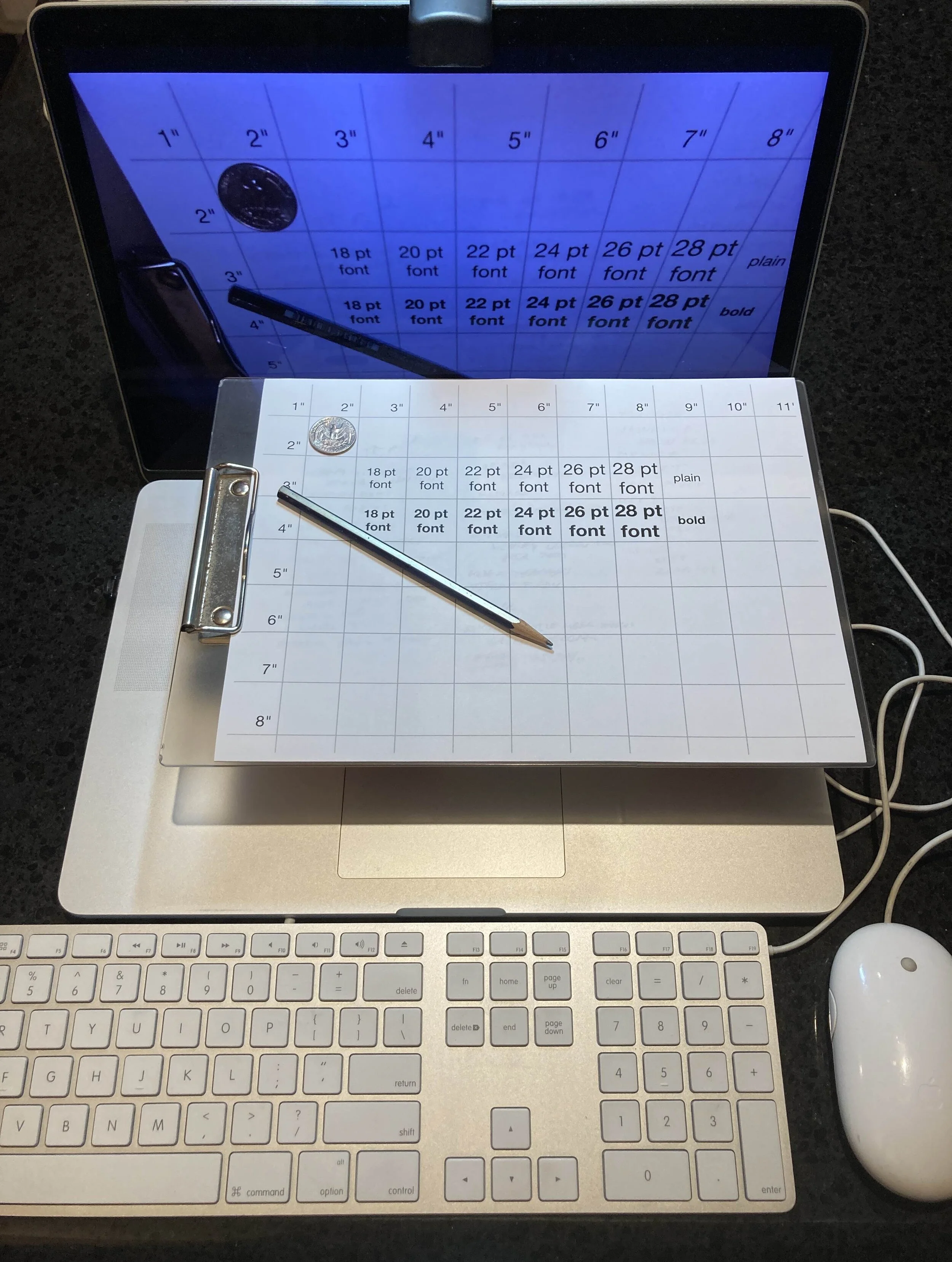 If you have a choice of laptops that you can use, you may decide that bigger is better, as the larger the laptop, the further the keyboard is from the webcam and therefore the larger the visible area at the keyboard level. As you can see in the above images, a 15- or 16-inch laptop can let you show an entire sheet of 8.5 x 11" of paper; an 11-inch model will let you show a bit more than a horizontally-oriented 5x8" index card. In general a more powerful laptop will likely also have a higher-quality webcam, which is a plus for our purposes.